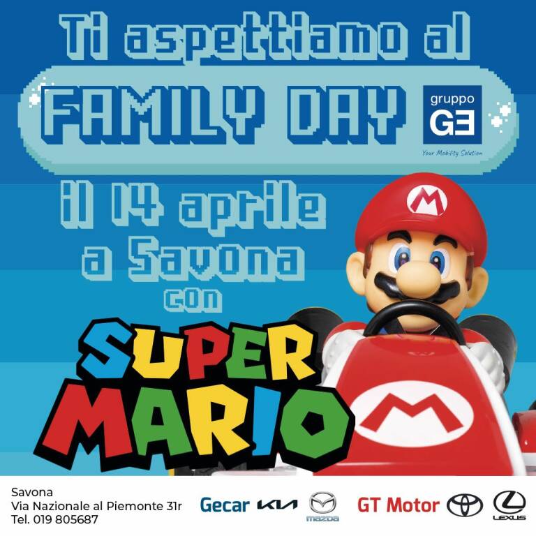 Venerdì 14 aprile dalle 15,30 alle 18, nelle concessionarie Gecar e GT Motor di Savona, si festeggia il Family Day di Gruppo GE tutto a tema Super Mario Bross.
